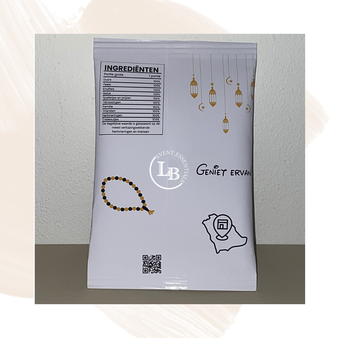 Elk zakje chips wordt voorzien van een glossy wikkel in jouw gekozen thema, perfect voor uitdelen op school, verjaardagen, babyshowers, bruiloften of andere feestelijke gelegenheden. Voeg namen, leeftijden of een speciale boodschap toe en creëer een unieke traktatie die zowel leuk als lekker is. Een smaakvolle en stijlvolle verrassing voor jouw gasten!